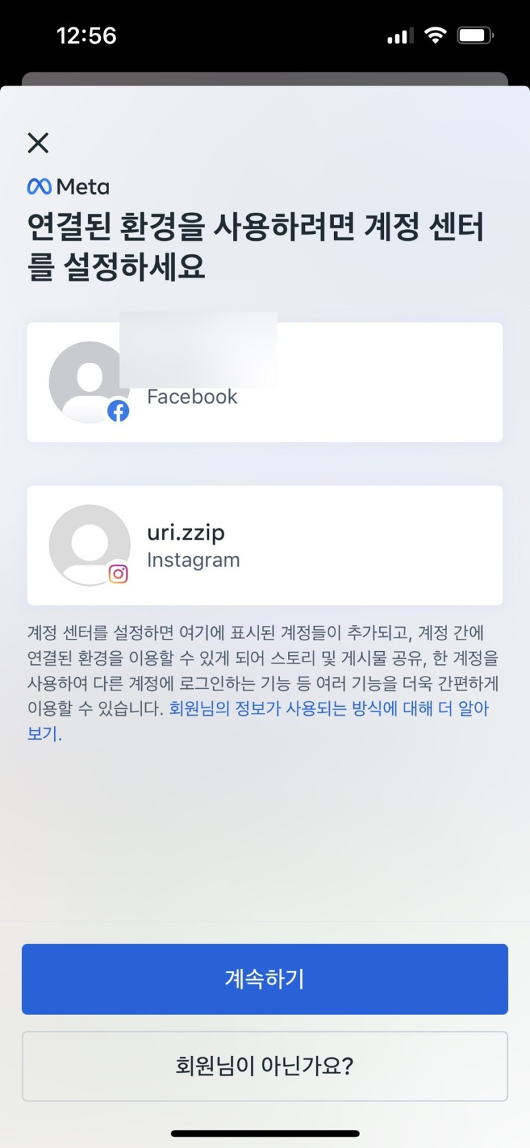그러면 페이스북 내 계정과 인스타 계정이 뜨는데
